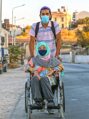 'Toen wij eind 2019 aankwamen in kamp Moria, was het koud en regenachtig. We kregen een zomertentje mee en moesten ons verder maar redden. Dit had ik nooit verwacht: geen beschutte plek, geen verwarming, geen basale mensenrechten. Toen Moria maanden later afbrandde, heb ik in de haast alleen mijn moeder en de rolstoel meegenomen. Haar kunstgebit ging verloren. Het lukt me niet eens een nieuw kunstgebit voor haar te regelen, mijn moeder kan al een jaar niet gewoon eten.'