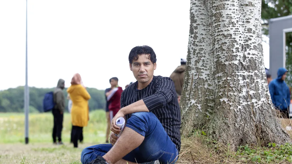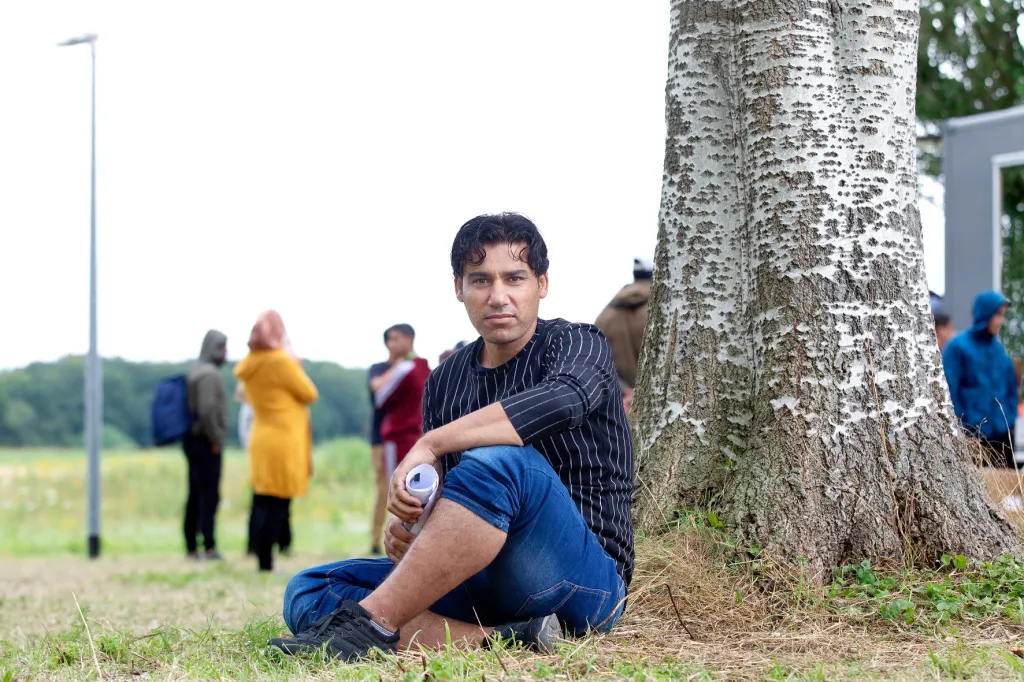 De Syrische Ahmed (33) arriveerde een week geleden in zijn eentje bij aanmeldcentrum Ter Apel met alleen de kleren die hij aan had. Het centrum bleek vol en dus sloot Ahmed zich aan bij de groeiende groep asielzoekers die bivakkeert voor de ingang. Hij zit tussen de geparkeerde auto’s op het gras naast het aanmeldcentrum, op deze hete dag geven de bomen wat verkoeling.