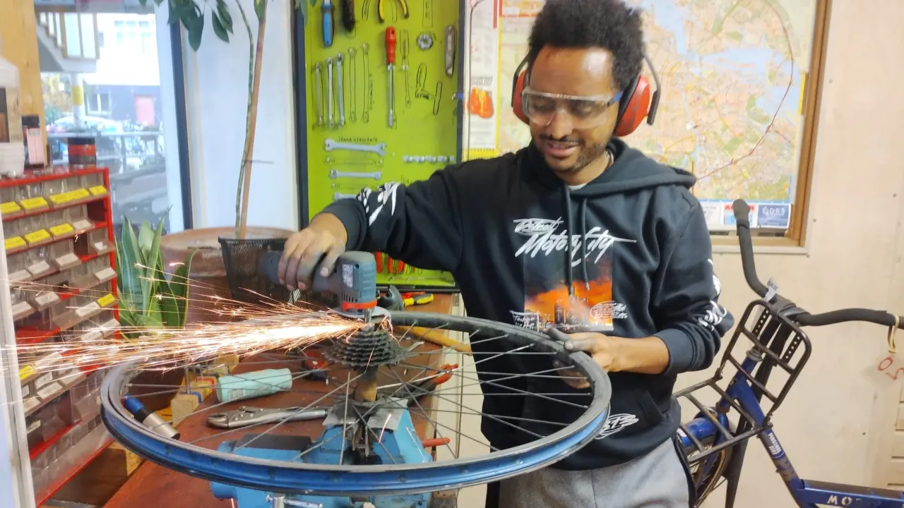 Ik ben zelf gaan Googelen: gratis taalles in Amsterdam. Google Maps aan en fietsen maar. Ik volg nu drie dagen per week taalles. In hetzelfde gebouw als de taalschool, zit de sociale fietsenwerkplaats Schept ‘n Band. Daar stapte ik naar binnen. Nu doe ik er drie dagen in de week vrijwilligerswerk.'