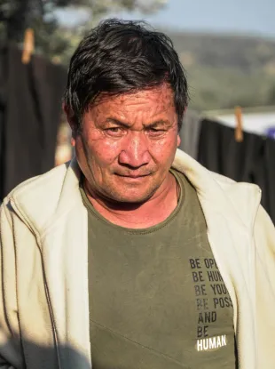 'We zijn zeven maanden geleden gevlucht uit Iran,' vertelt Ramazan. 'Twee maanden en twaalf dagen geleden kwamen we aan in Moria. Het is hier heel zwaar. Ik heb veel pijn in mijn knieën en mijn rug – ik heb arthritis. Bovendien ben ik blind aan het worden, mijn ogen gaan snel achteruit. Dat maakt het moeilijk om naar de wc te gaan, of water te halen. Alles is ver weg.'