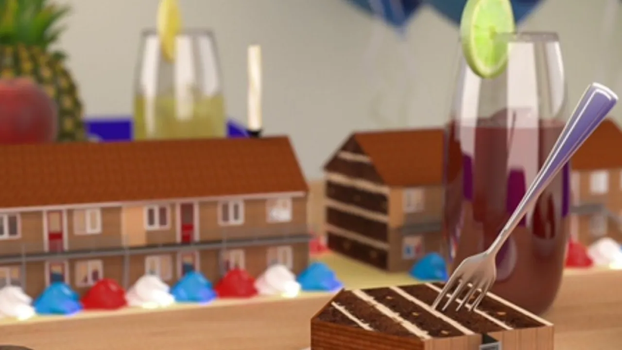 En zo is er ook de afbeelding waarin Ribal zichzelf heeft geportretteerd, klimmend naar vrijheid op een trap van azc-meubels. Of het beeld waarin Ribal zijn eenjarig verblijf in azc Emmen viert - de taart een replica van het azc.