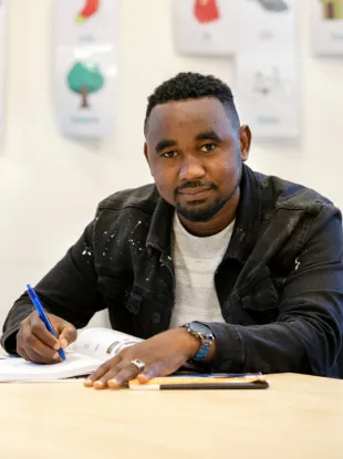 'Voordat ik kon gaan inburgeren moest ik alfabetiseren. Je leert dan alles over het alfabet, maar ik wilde méér oefenen. Een vriend zei dat ik in de bibliotheek moest vragen naar een taalcoach. Ik kwam daar al vaak om de computer te gebruiken, maar sindsdien vroeg ik iedere keer bij de balie: "Mag ik een taalcoach?" Pas later begreep ik dat je pas een taalcoach krijgt als je begint met inburgeren. Inmiddels heb ik drie weken inburgeringsles én al twee keer mijn taalcoach gezien! Ik ben zo blij: vijf maanden heb ik op mevrouw Thea gewacht.'