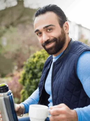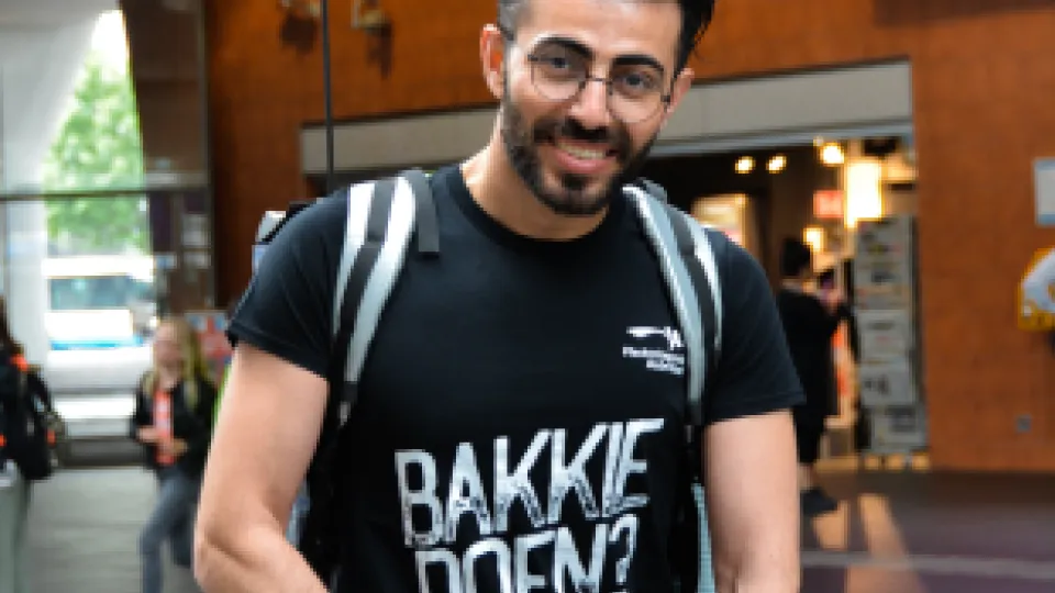 'Ik hou van Nederlanders en van praten, dus toen er vrijwilligers werden gezocht voor Bakkie Doen? dacht ik: "Mooi, dat ga ik doen." Nederlanders zijn heel vriendelijk, maar echt contact met hen krijgen is soms moeilijk. Ze hebben hier al hun eigen drukke leven. Als vluchteling moet je daarom dapper zijn en vaak het eerste stapje zetten. Tijdens Bakkie Doen? mogen mensen mij alles vragen. Vaak willen ze weten waarom ik moest vluchten en hoe ik hier gekomen ben. Soms merk ik dat iemand nooit eerder met een vluchteling heeft gesproken. "Hadden jullie in Syrië internet?" "Heb je daar ook chocolade?" Ook op die vragen geef ik serieus antwoord.'