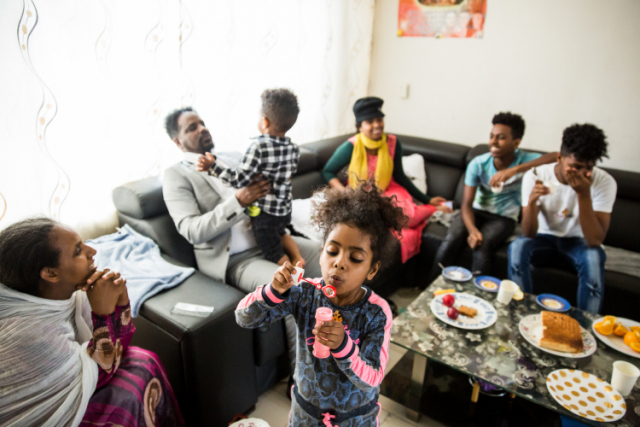 Op de zwarte hoekbank van het rijtjeshuis in het vissersdorp Urk zit Tsegab (43). Op schoot zit zijn jongste zoon en zevende kind Jacob, een stevige baby die alles met grote ogen observeert. Aan de muur hangen familiefoto’s en kleurige wandkleden en posters met afbeeldingen van Maria en Jezus en teksten in het Ethiopisch schrift. Zijn vrouw Fekadu (39) komt uit de keuken in lange jurk, een witdoorzichtige hoofddoek losjes over haar kleine vlechtjes. Ze zet kopjes thee, een bakje suiker en partjes appel en sinaasappel op de glazen salontafel. Boven de ingang van de keuken hangt een bord met de tekst: "Welkom thuis! Fijn dat je weer thuis bent." 'Die had onze vader voor ons opgehangen toen we hier drie jaar geleden aankwamen,' vertelt dochter Rahel (18). Naast haar zit Simon (14) en hun zusje Nazareth (5) die verdiept is in een filmpje op haar vaders telefoon.